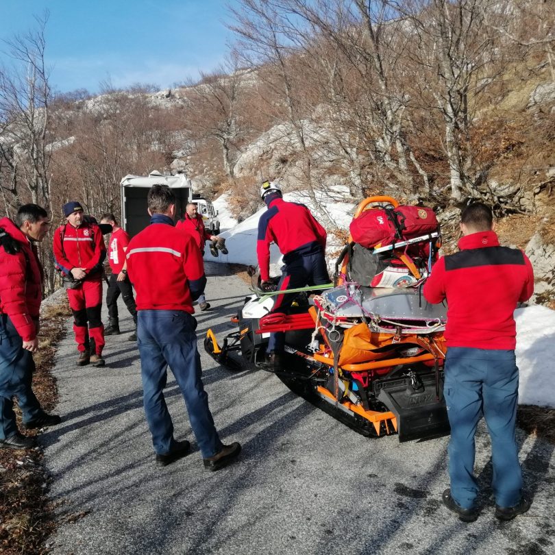 U startu prolazno vrijeme nam je zaostatak od 1 sata… Udaljenost za koju znamo je 90 km vozilima, 6 km hodanja ili motornim saonicama ukoliko je moguće, a ostalo ćemo tek vidjeti. Ozljede potencijalno opasne po život, hitnost najvišeg stupnja. Započinje utrka s vremenom. Kako smo na početku rekli da su naši kolege planinarili pa je tako ovaj put sretna okolnost bila što je jedna članica sa dvoje prijatelja bila baš na tom dijelu i baš na signalu u trenutku pokretanja akcije pa smo je odmah uputili u susret pozivatelju te da nastavi prema unesrećenom kako bi ga utoplili i primarno zbrinuli jer to je u zimskom periodu najvažnije. Vremena za to nema puno.